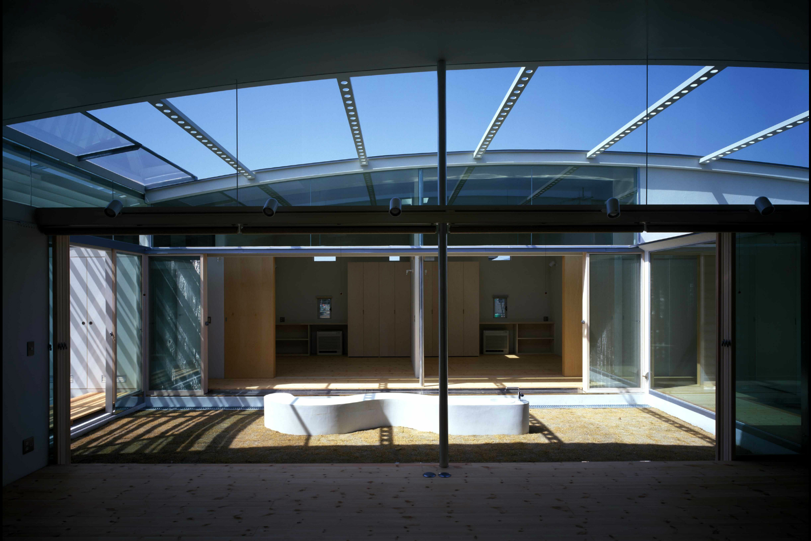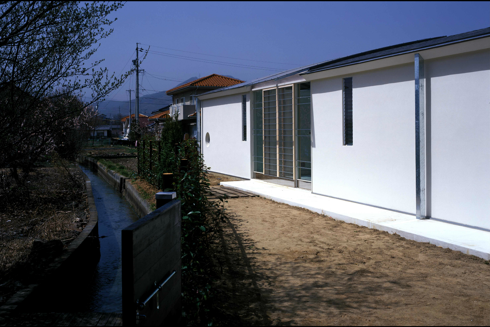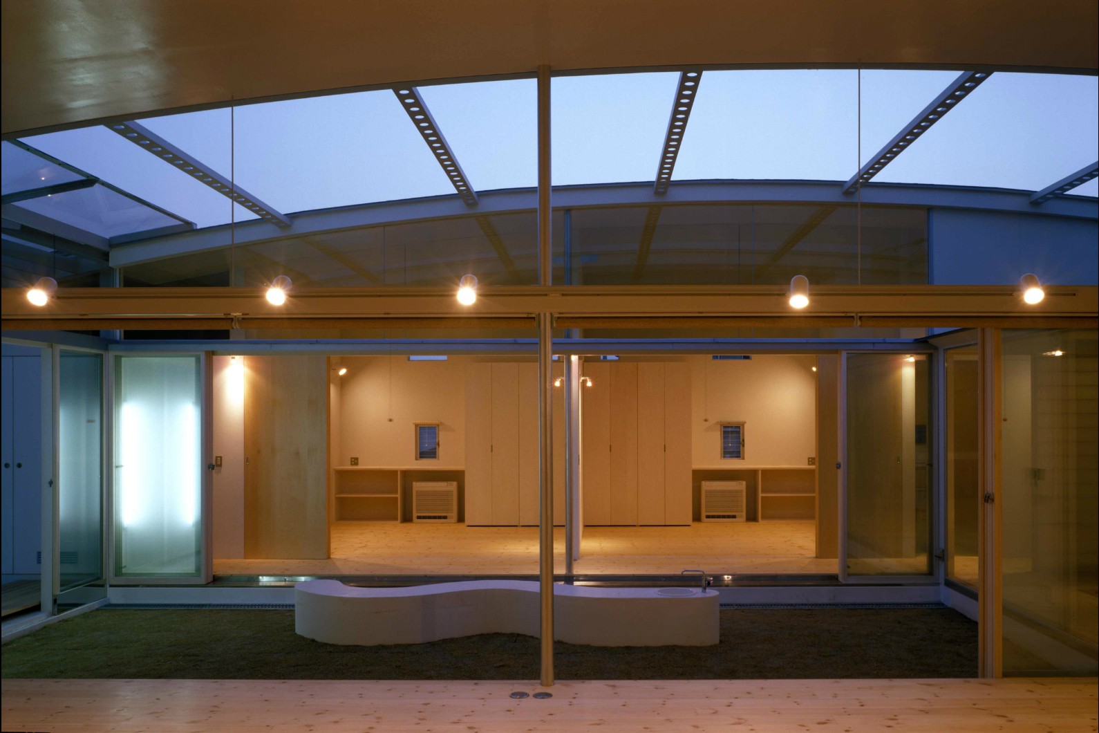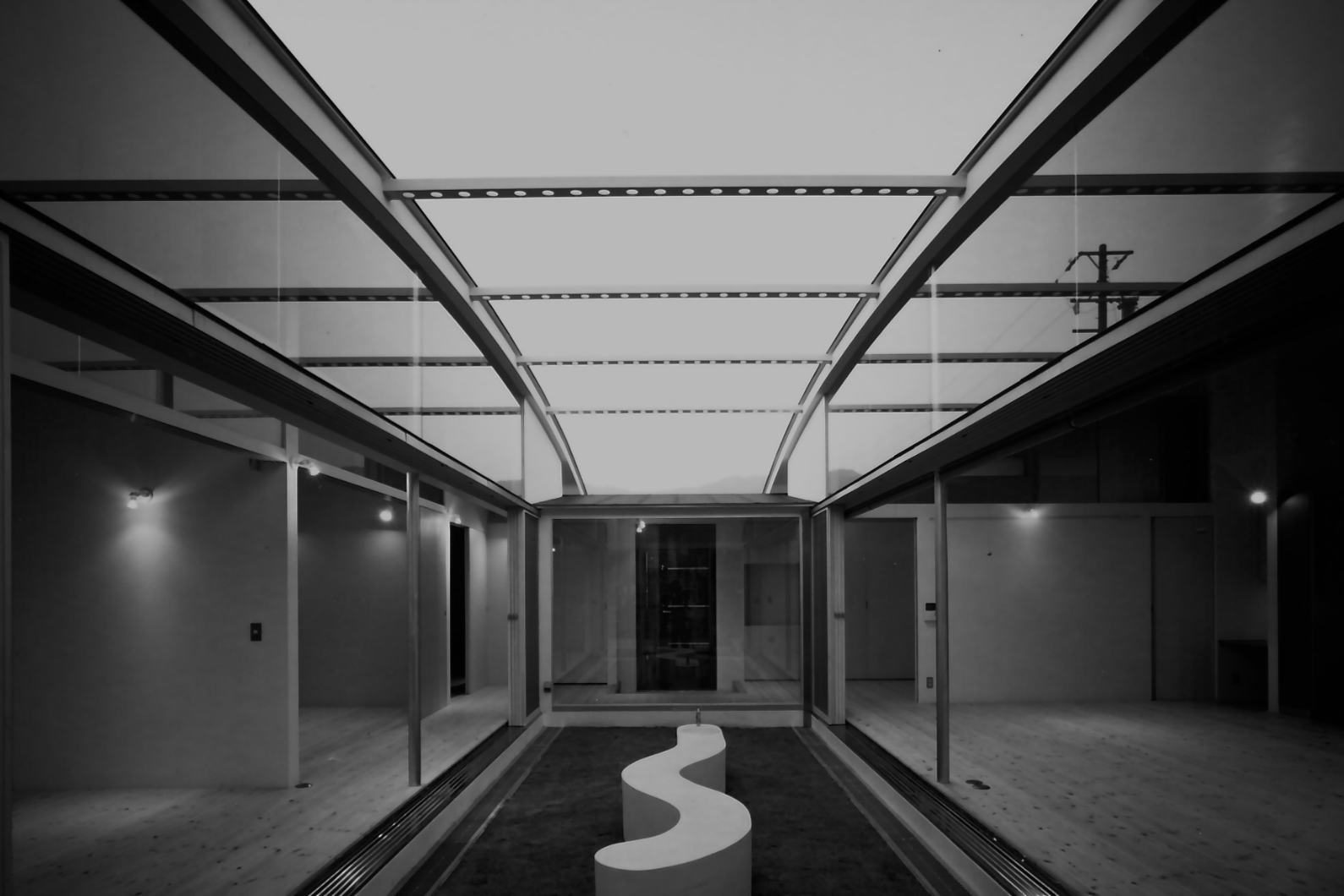鉄骨建方時 上田のシェルター 西面外観 ゲート 水路に面する南面 中庭 LDKから子供部屋を見る 夕景 中庭よりLDKを見る LDK 玄関ホール 右:浴室と寝室をつなぐサンルームテラス 応接・書斎室 和室:壁は全面和紙貼り サニタリー・浴室