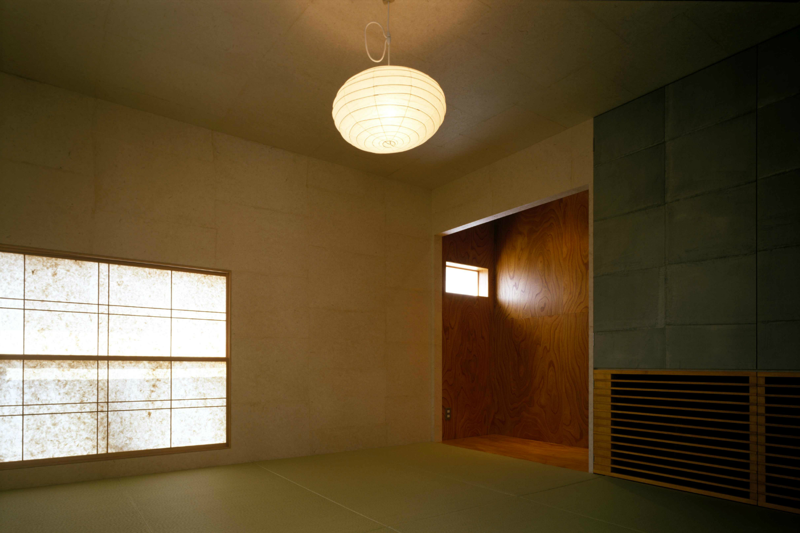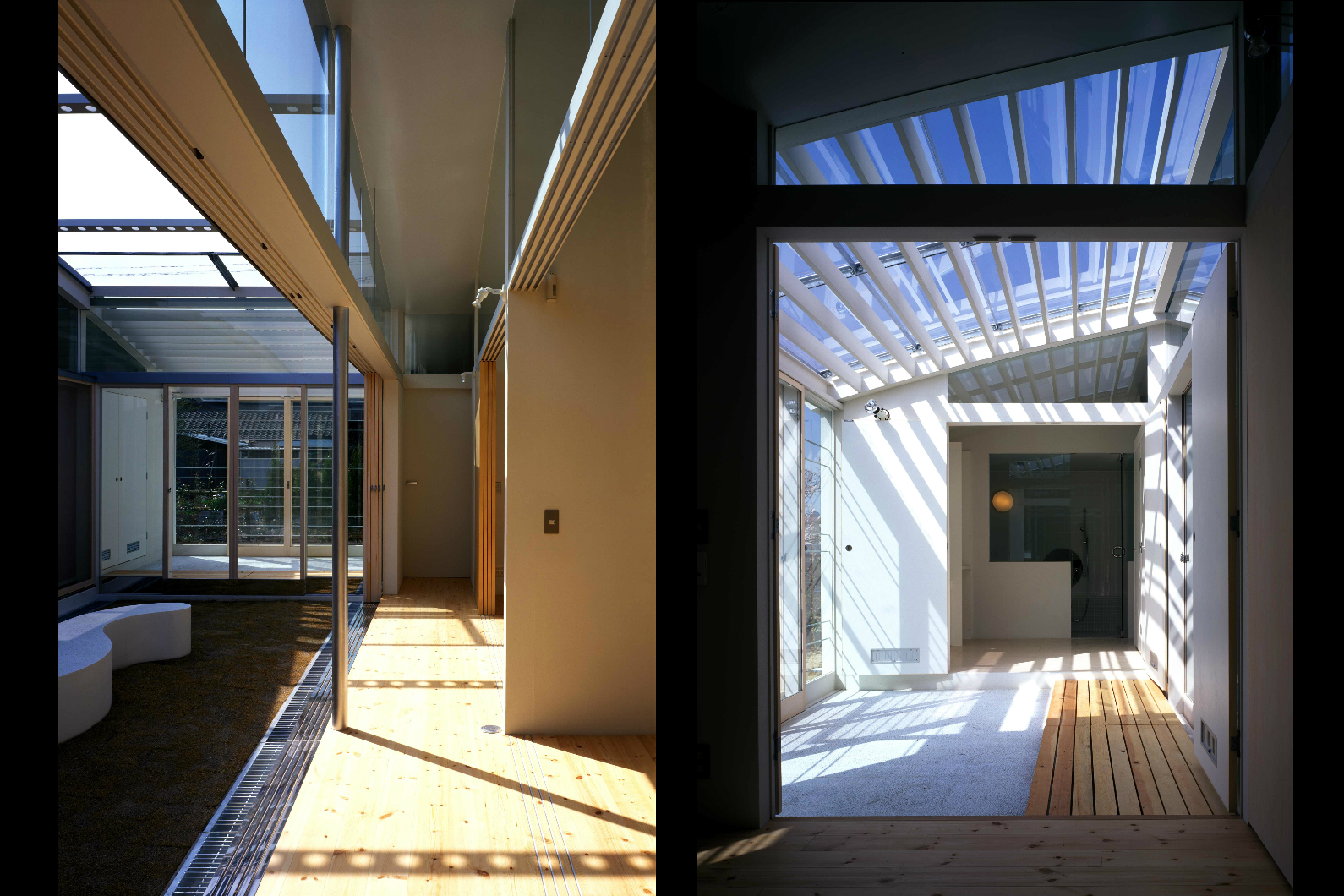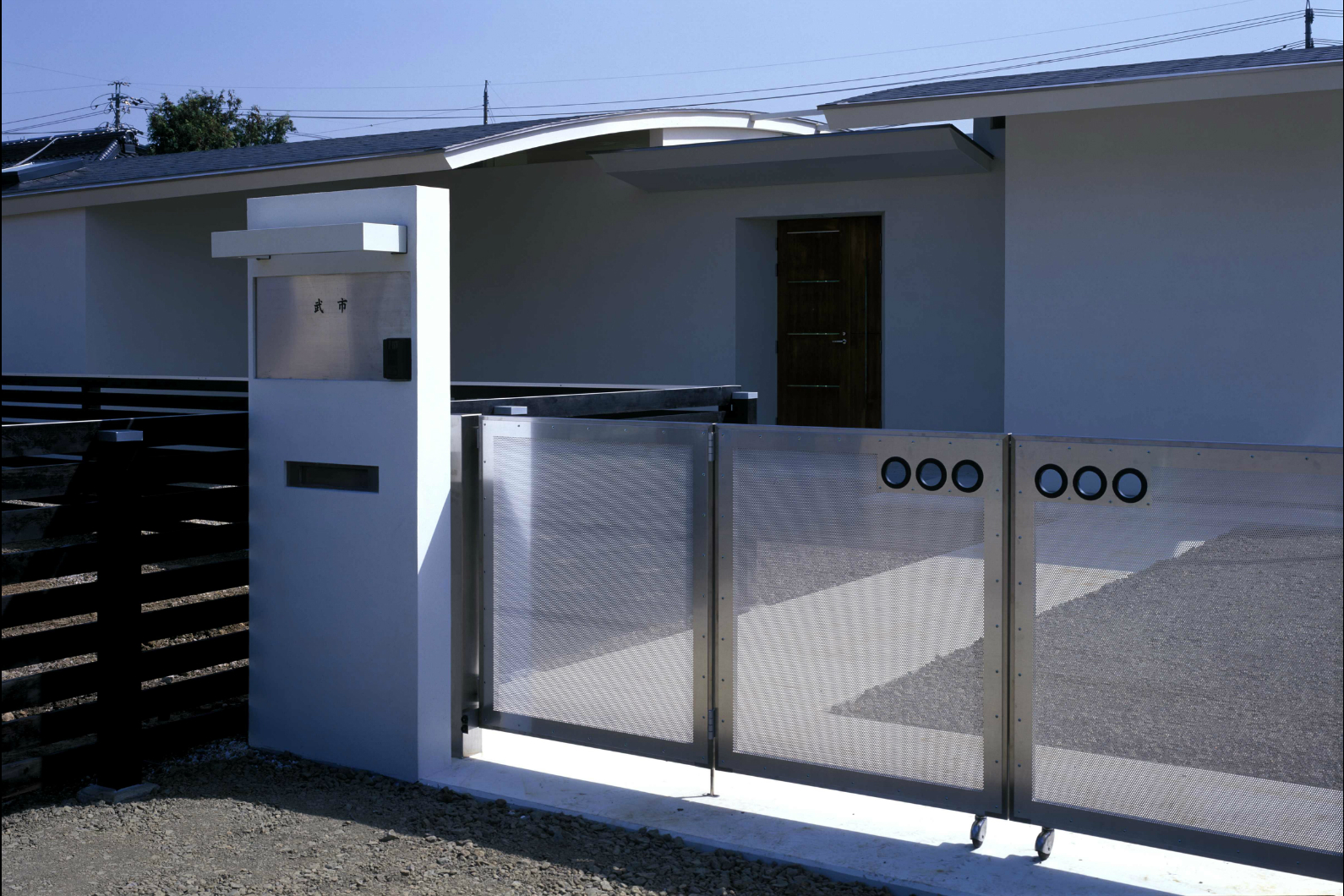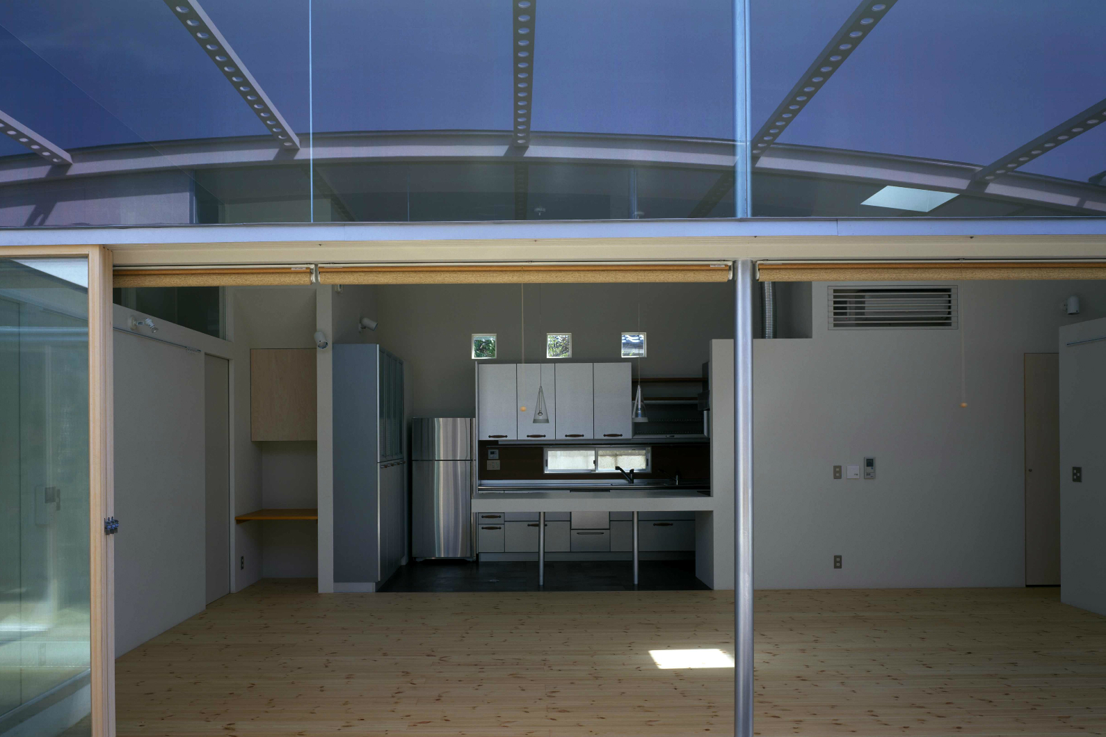 鉄骨建方時 上田のシェルター 西面外観 ゲート 水路に面する南面 中庭 LDKから子供部屋を見る 夕景 中庭よりLDKを見る LDK 玄関ホール 右:浴室と寝室をつなぐサンルームテラス 応接・書斎室 和室:壁は全面和紙貼り サニタリー・浴室