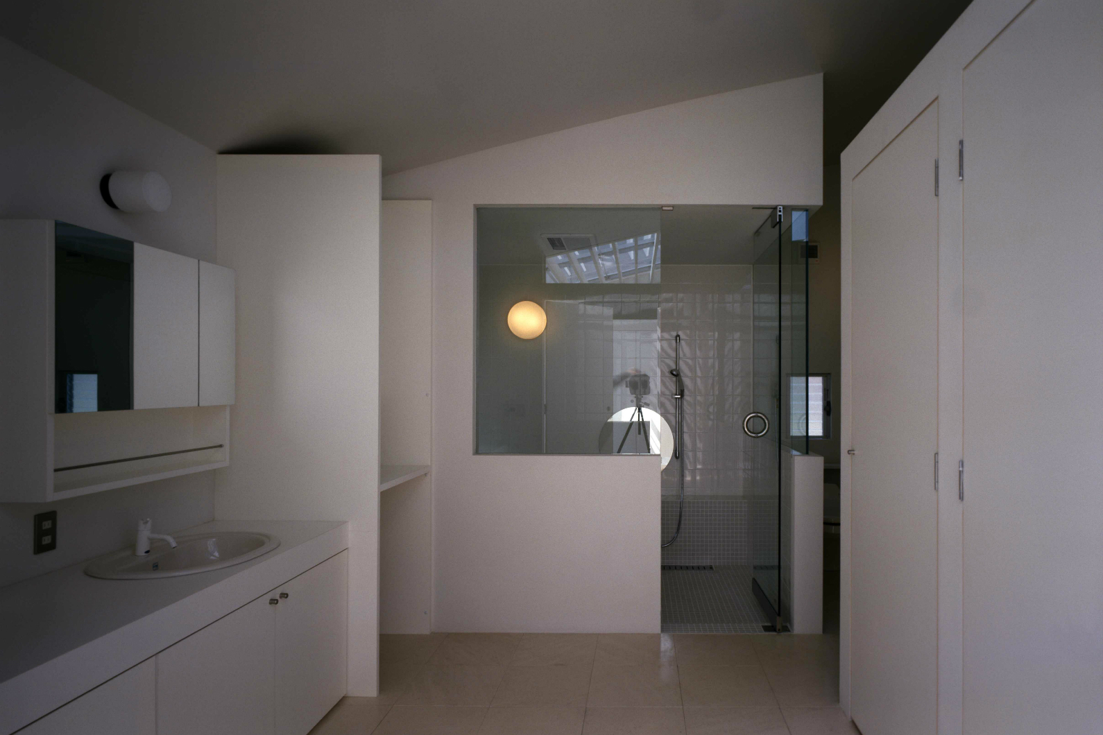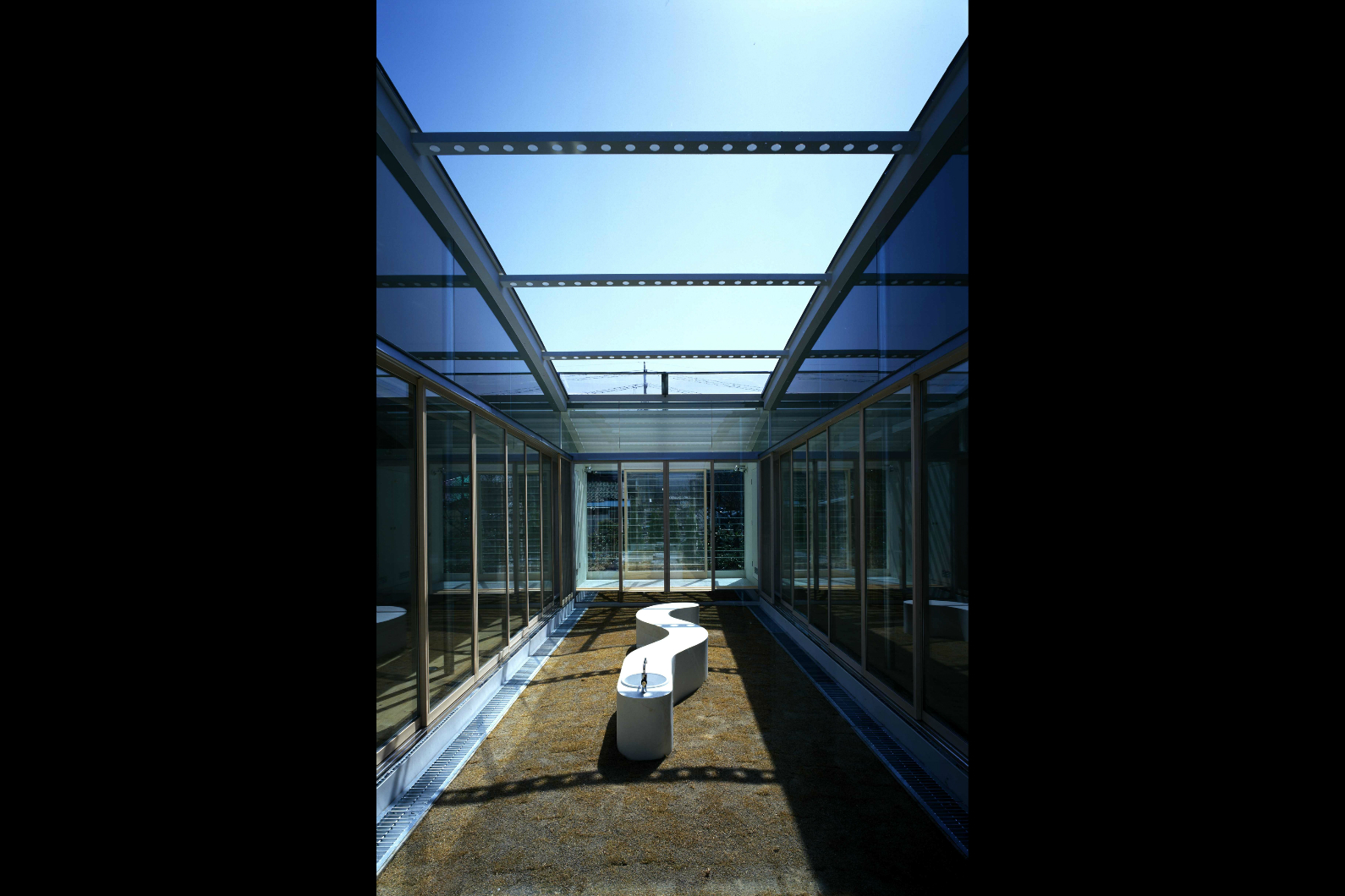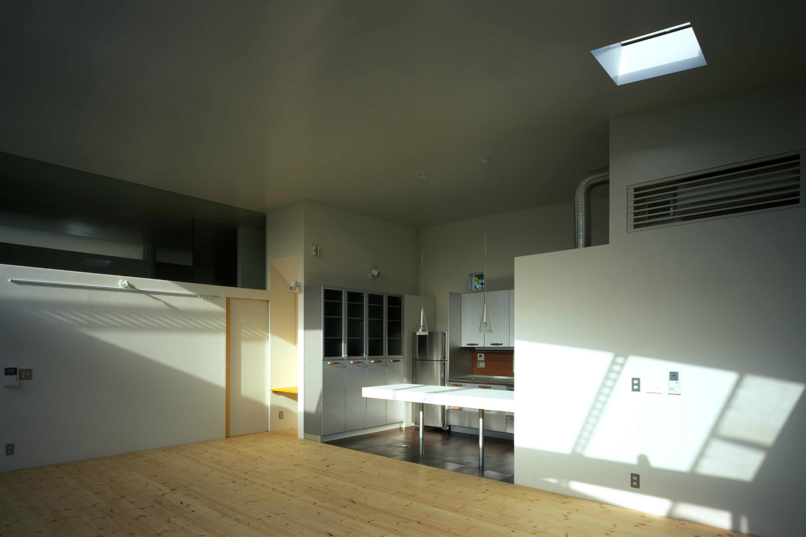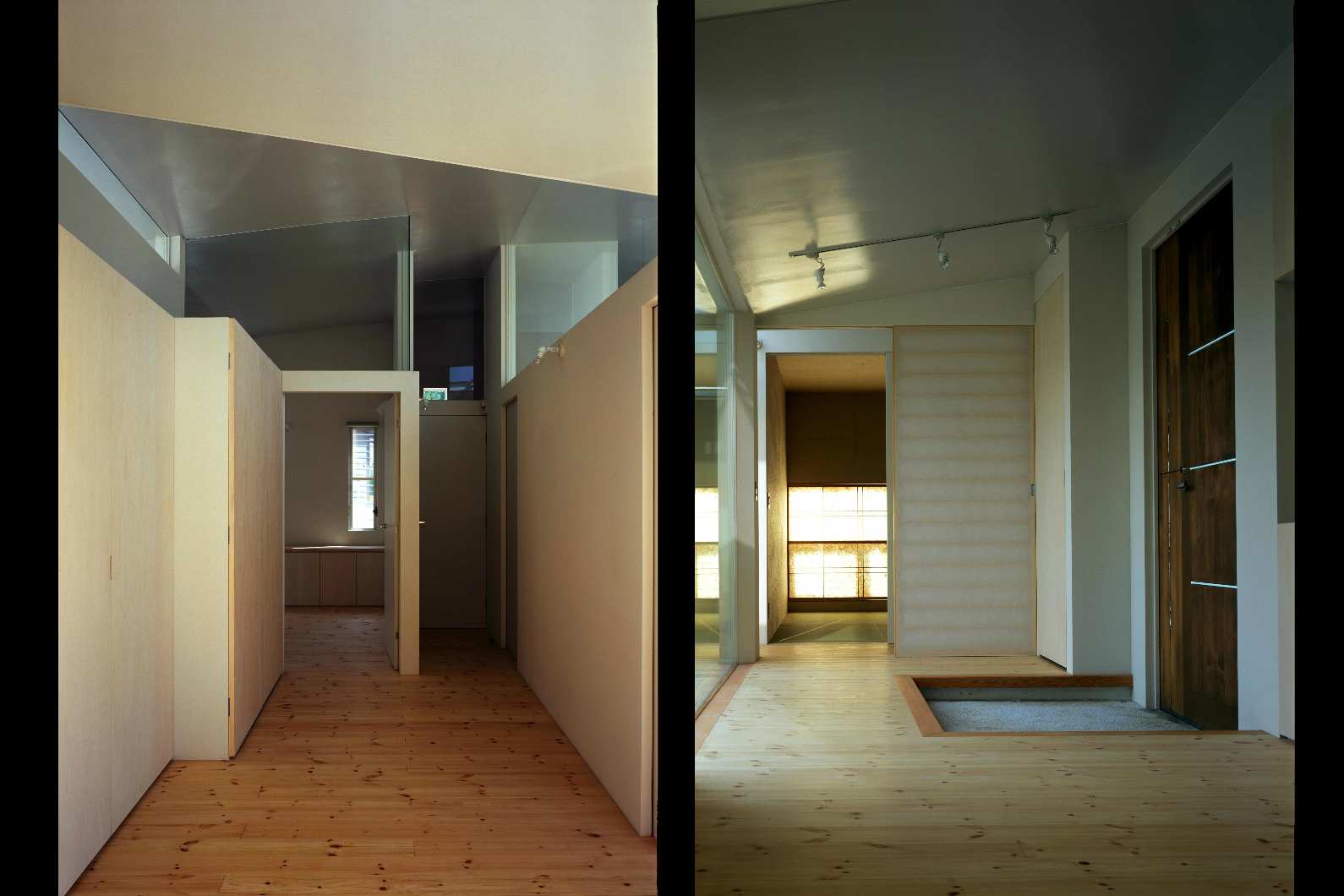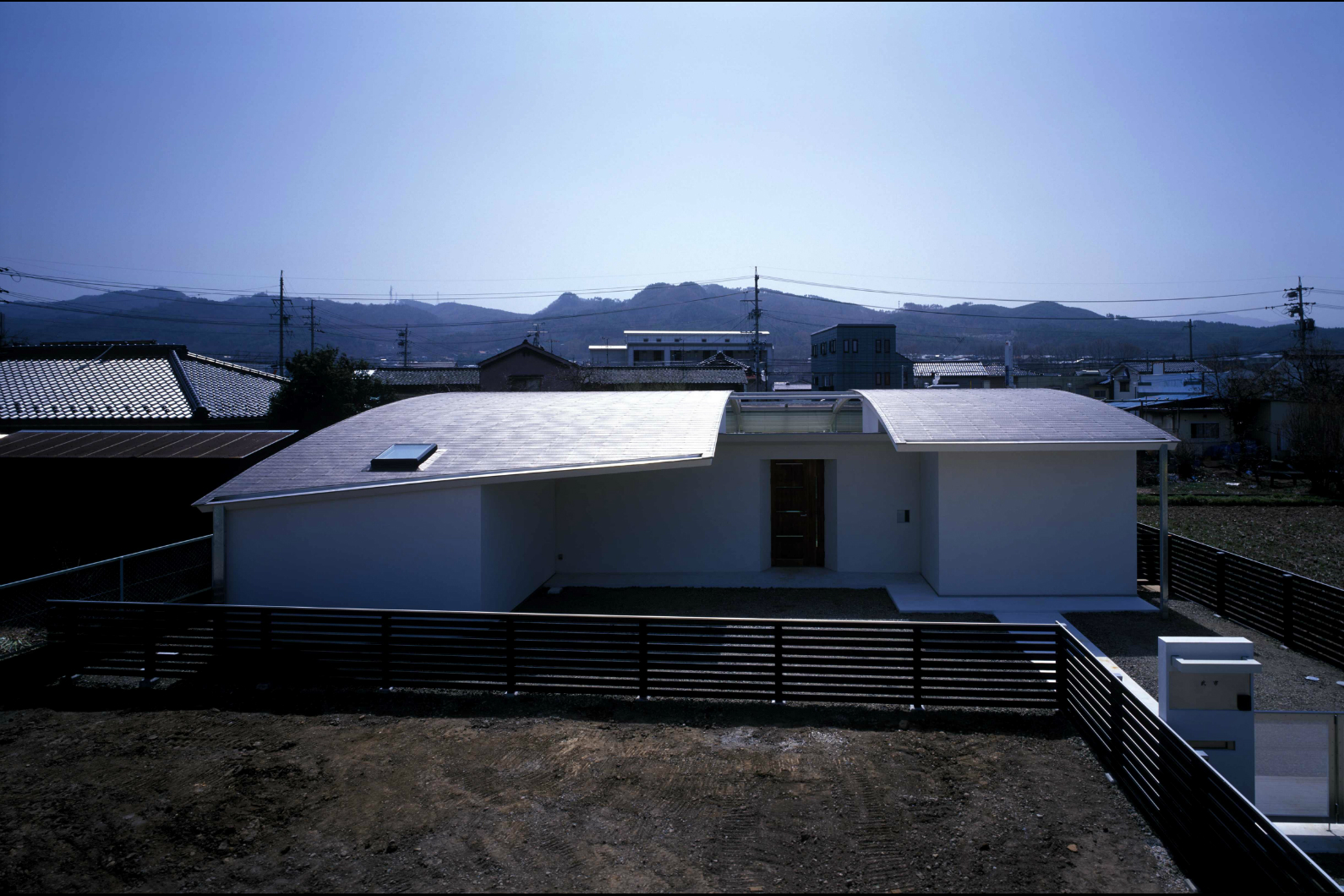 鉄骨建方時 上田のシェルター 西面外観 ゲート 水路に面する南面 中庭 LDKから子供部屋を見る 夕景 中庭よりLDKを見る LDK 玄関ホール 右:浴室と寝室をつなぐサンルームテラス 応接・書斎室 和室:壁は全面和紙貼り サニタリー・浴室