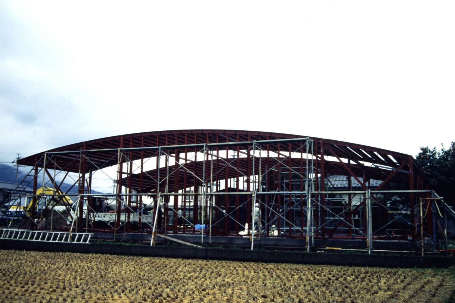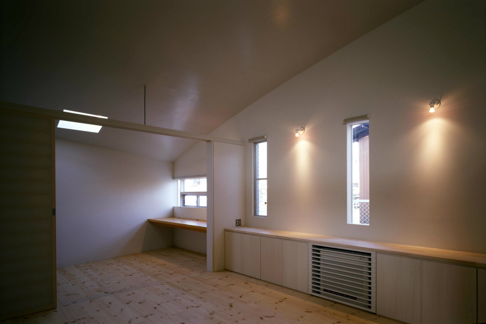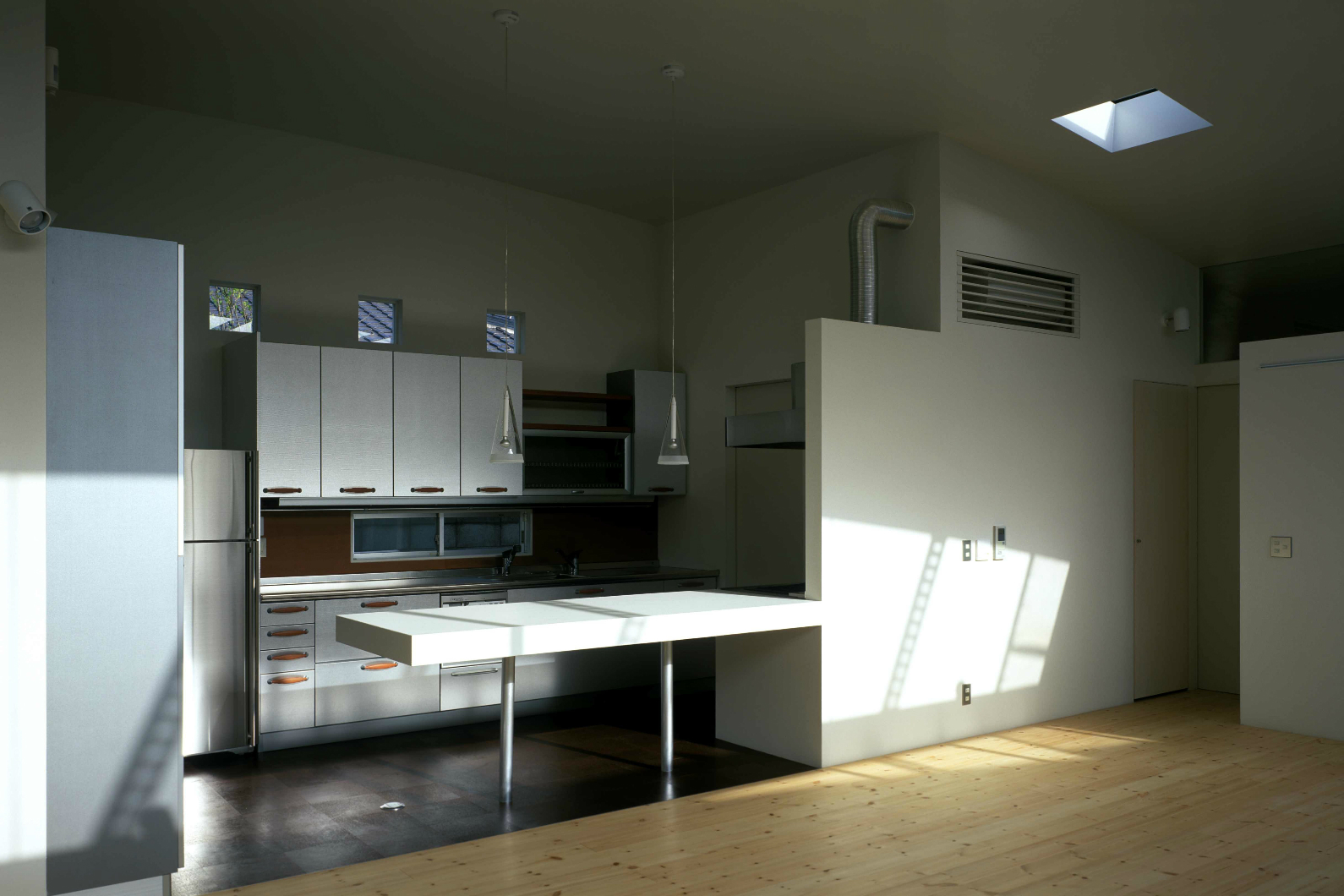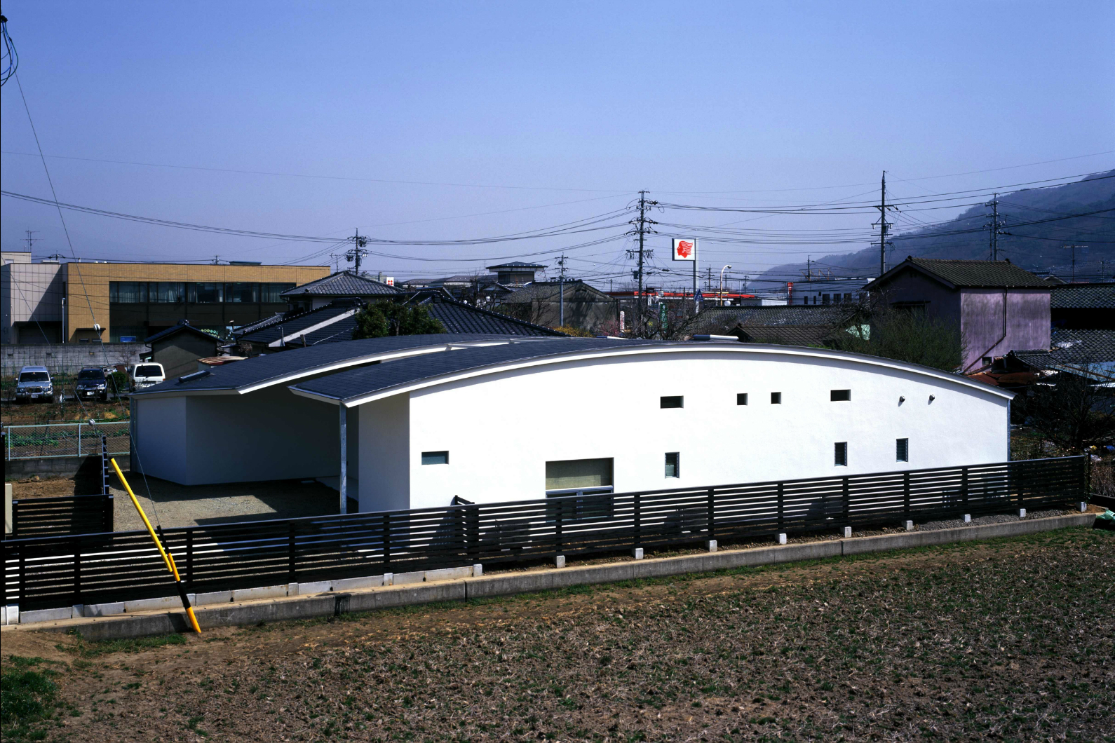 鉄骨建方時 上田のシェルター 西面外観 ゲート 水路に面する南面 中庭 LDKから子供部屋を見る 夕景 中庭よりLDKを見る LDK 玄関ホール 右:浴室と寝室をつなぐサンルームテラス 応接・書斎室 和室:壁は全面和紙貼り サニタリー・浴室