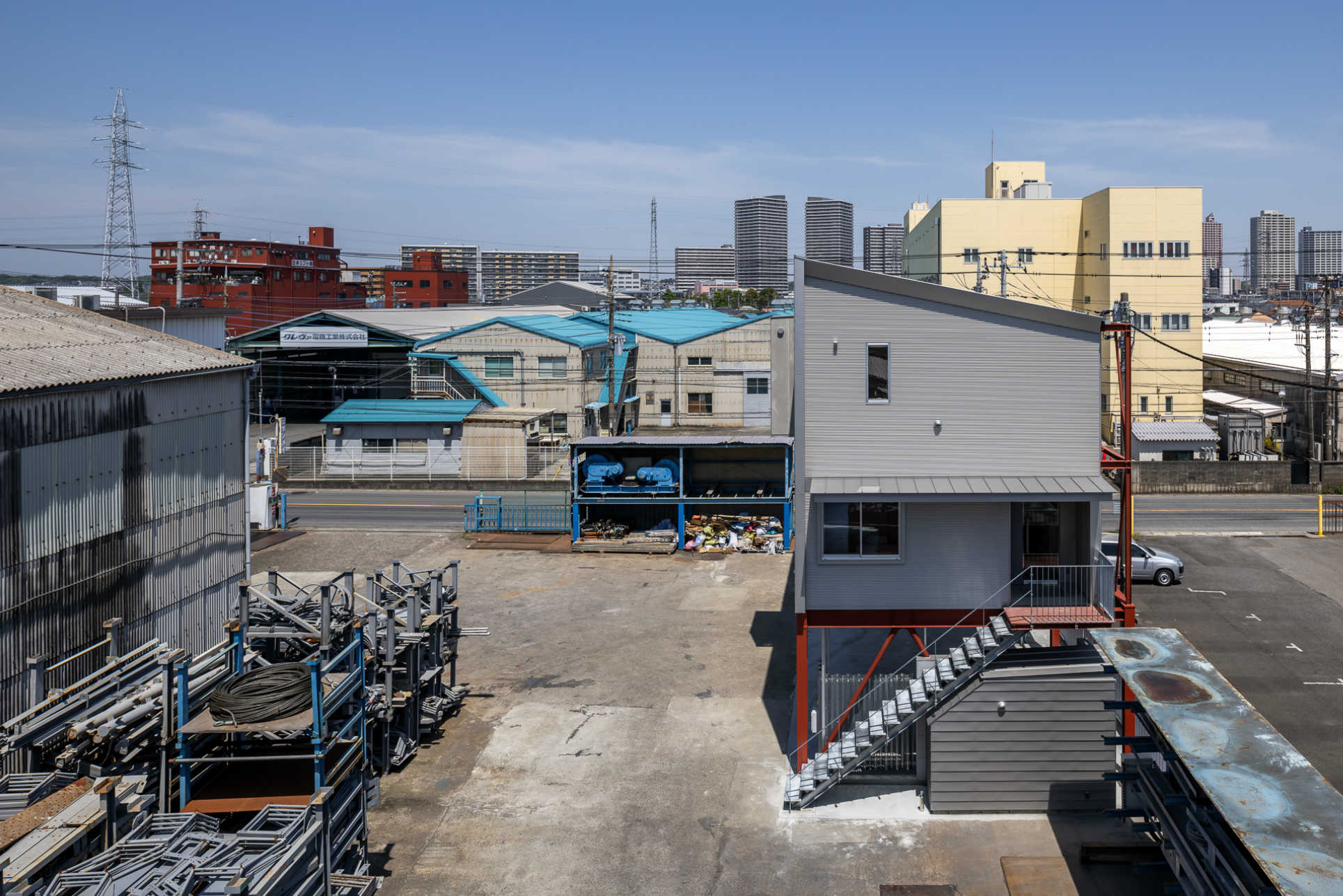 ■俯瞰:検査台より新事務所を見る。工場団地にある敷地の周辺は、工場建屋や資材に囲まれた無機質な景観。