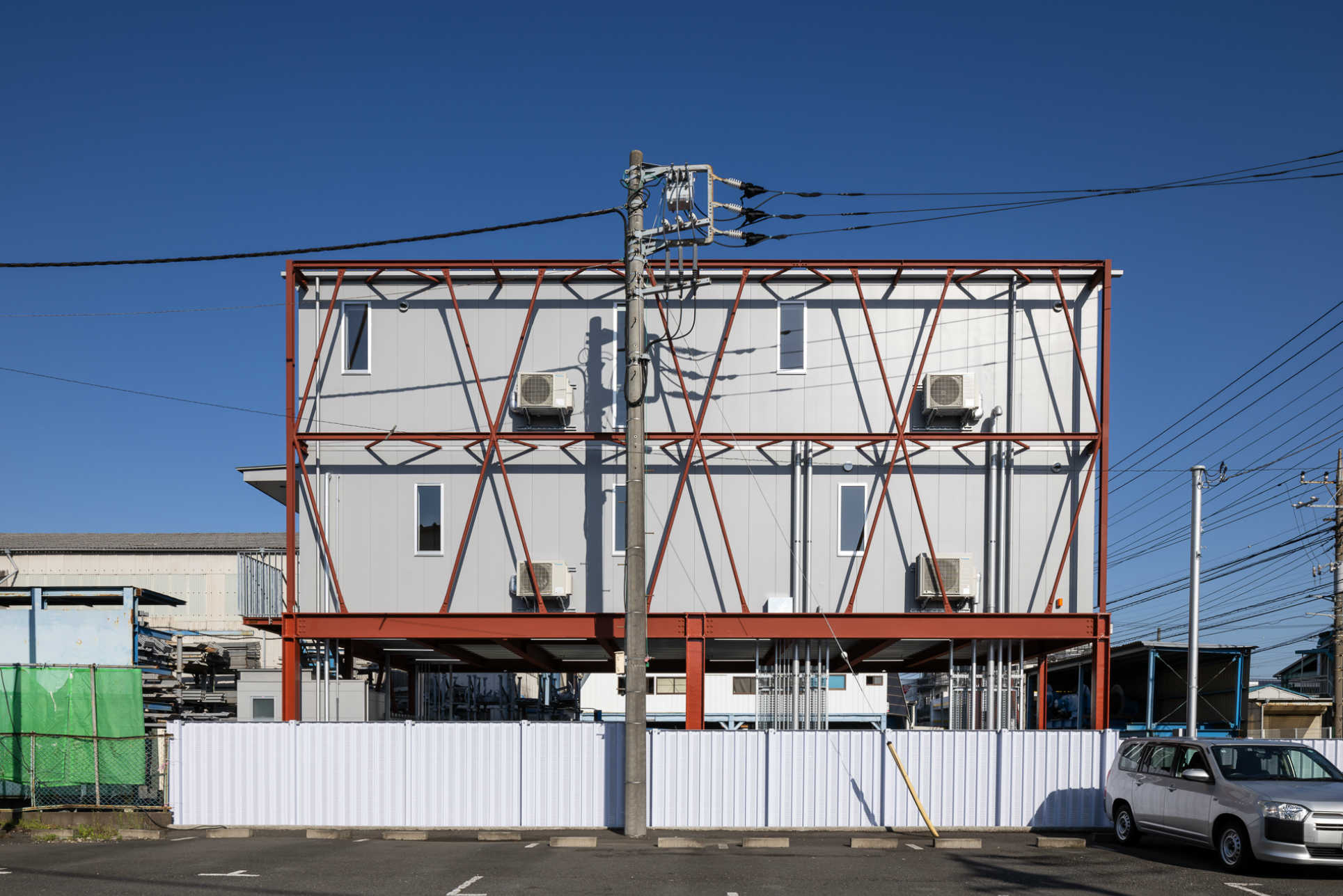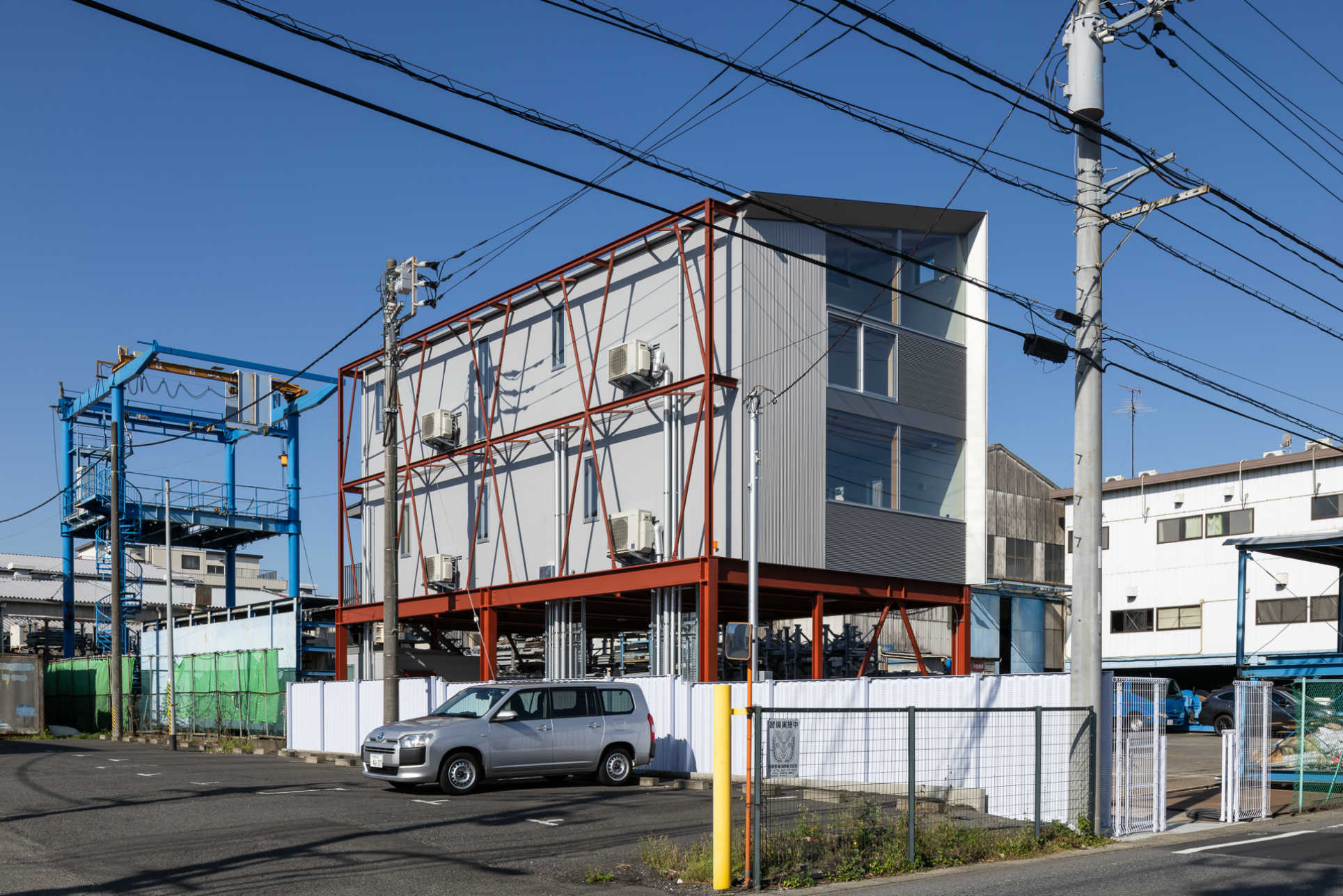 ■隣地(東)側外観:拡幅予定の前面道路(写真上)および、隣地駐車場(写真下)から東面足場スペースを見る。設備が集中する東面は、構面を700㎜ほど外にずらして、メンテ用の足場スペースを設けた※最終頁に図面を添付