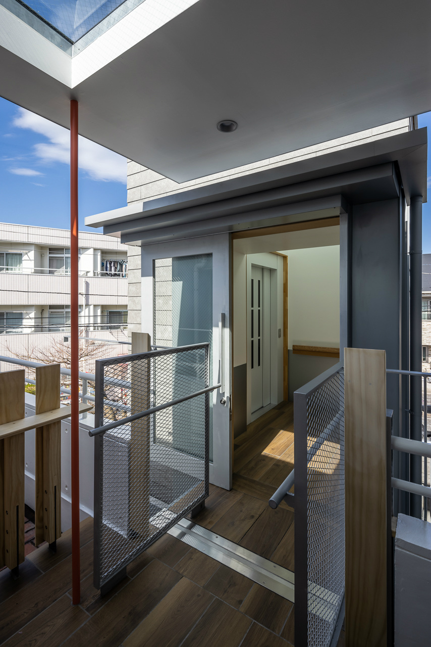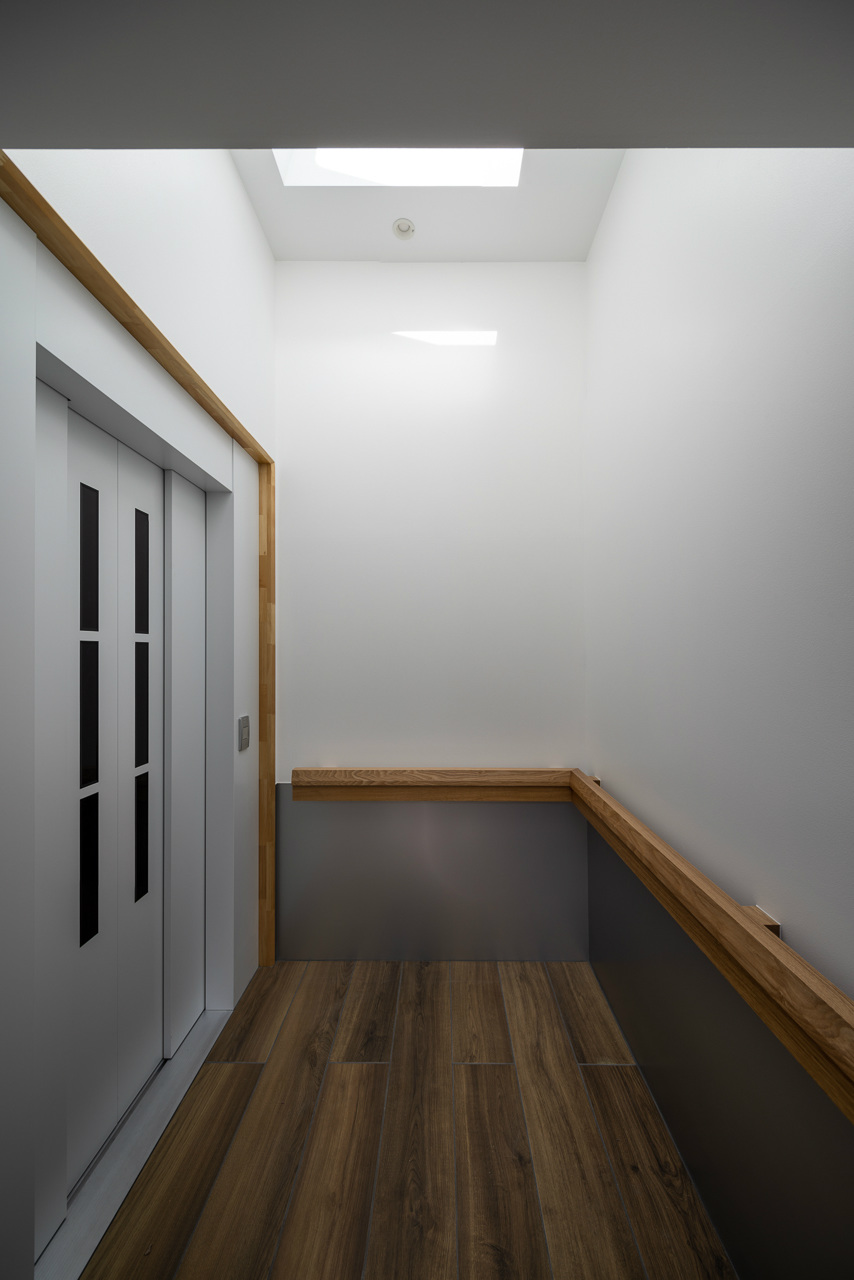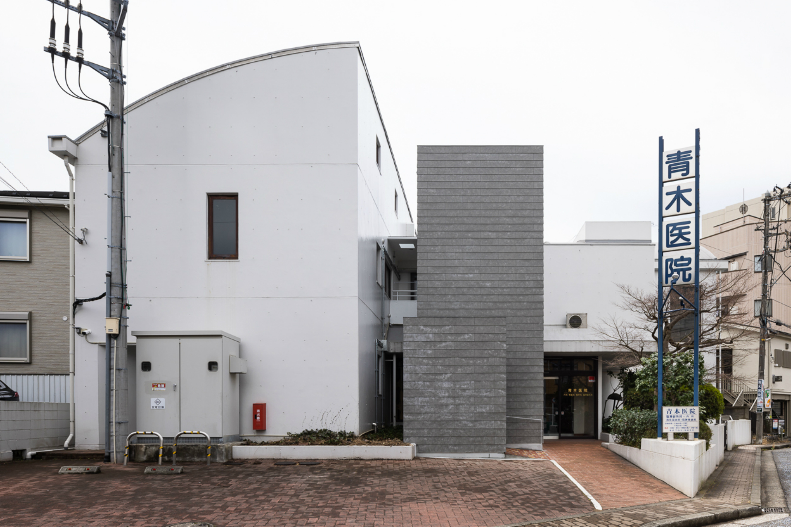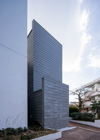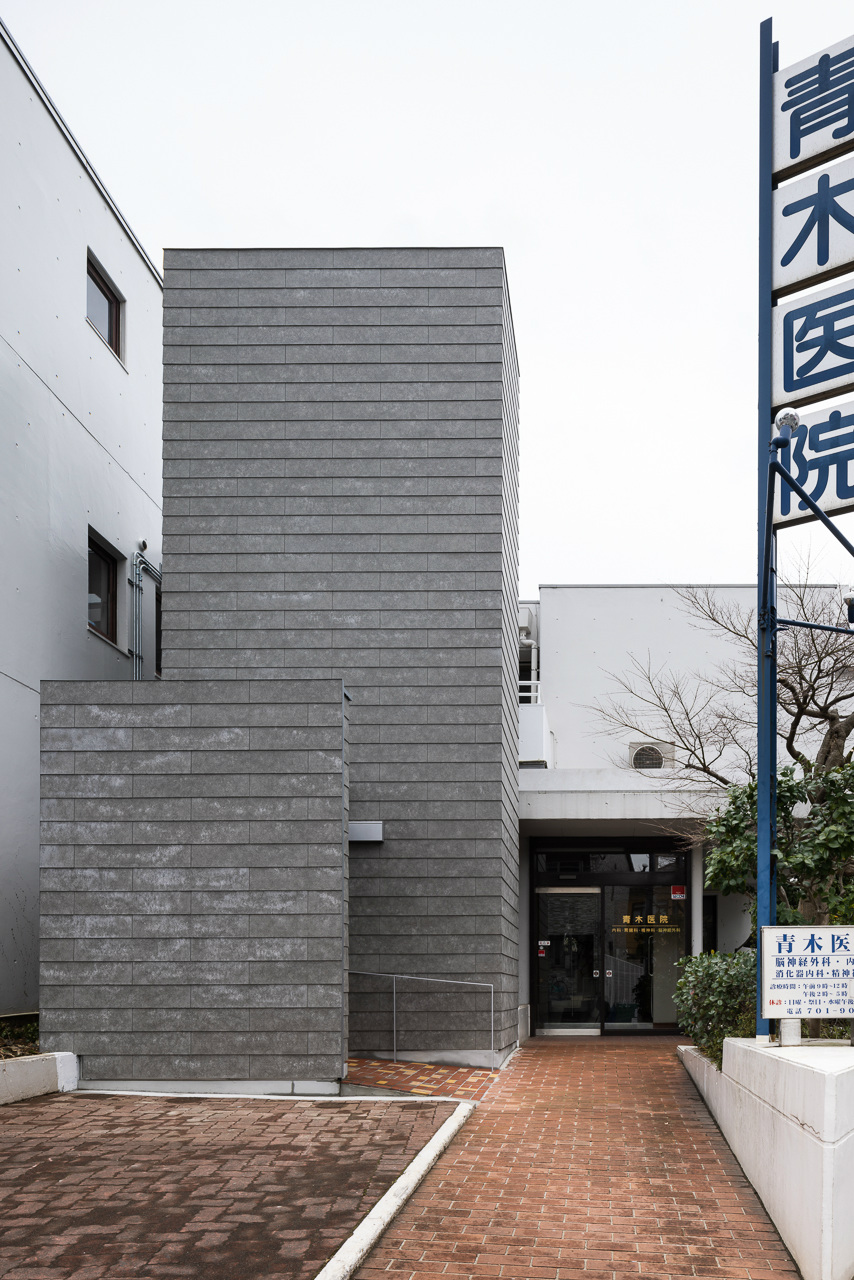 診療所併用住宅の増築事例です。1階が診療所のため、上階で暮らす住み手の高齢化に合わせて『エレベーター棟』を増築しました。オブジェではなく、『エレベーター棟』としての存在意義を持つ建築装置なので、過剰な形態操作は控え、スレート下見板張りとすることで石柱のような表情をつくり、非建築的なスケール感を強調しました。