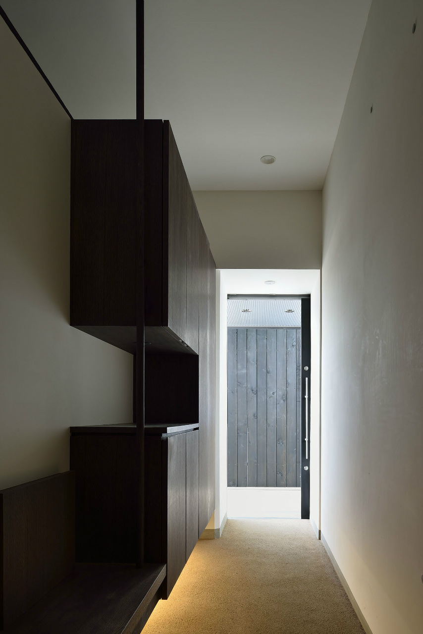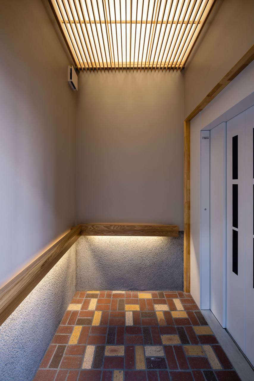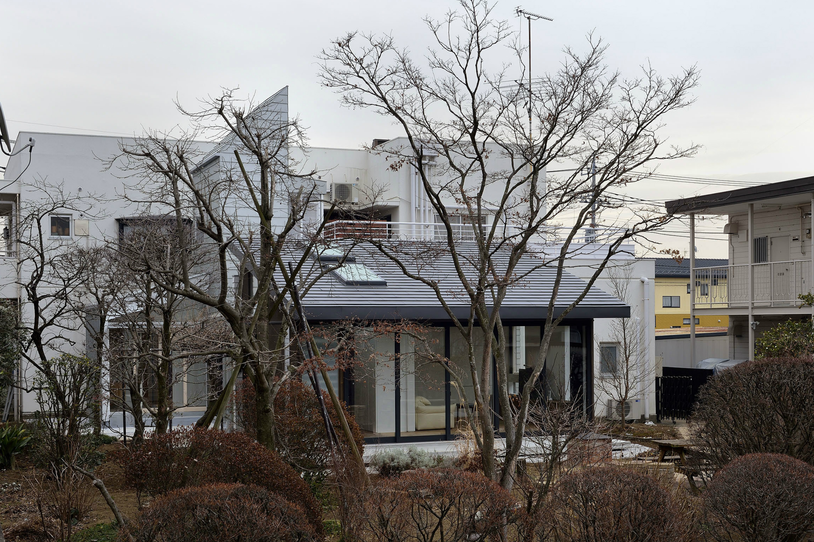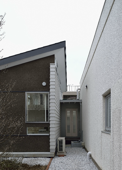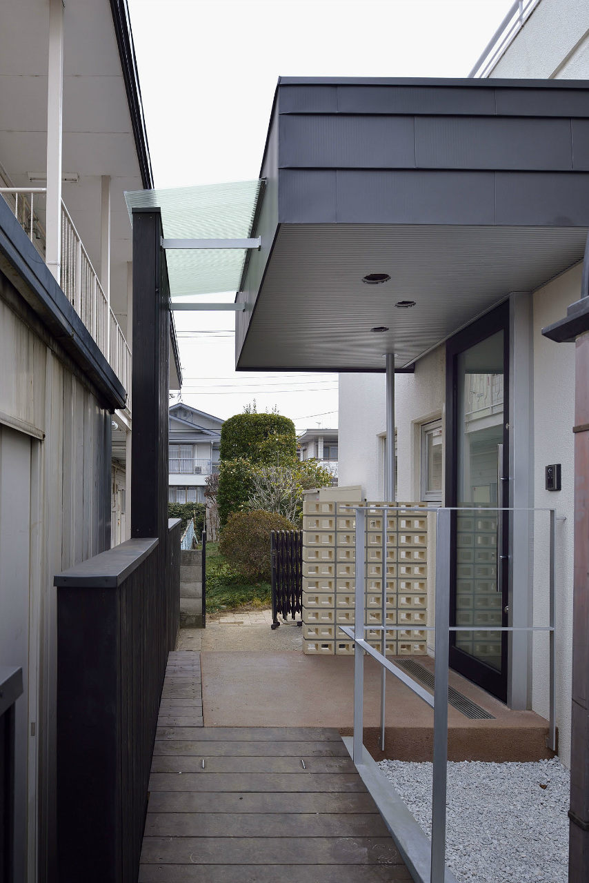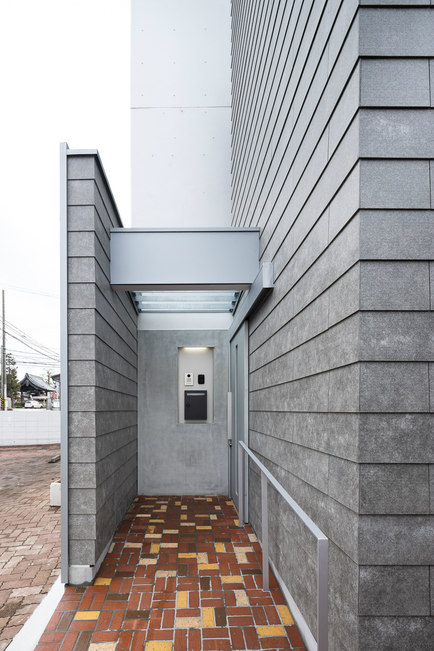 診療所併用住宅の増築事例です。1階が診療所のため、上階で暮らす住み手の高齢化に合わせて『エレベーター棟』を増築しました。オブジェではなく、『エレベーター棟』としての存在意義を持つ建築装置なので、過剰な形態操作は控え、スレート下見板張りとすることで石柱のような表情をつくり、非建築的なスケール感を強調しました。