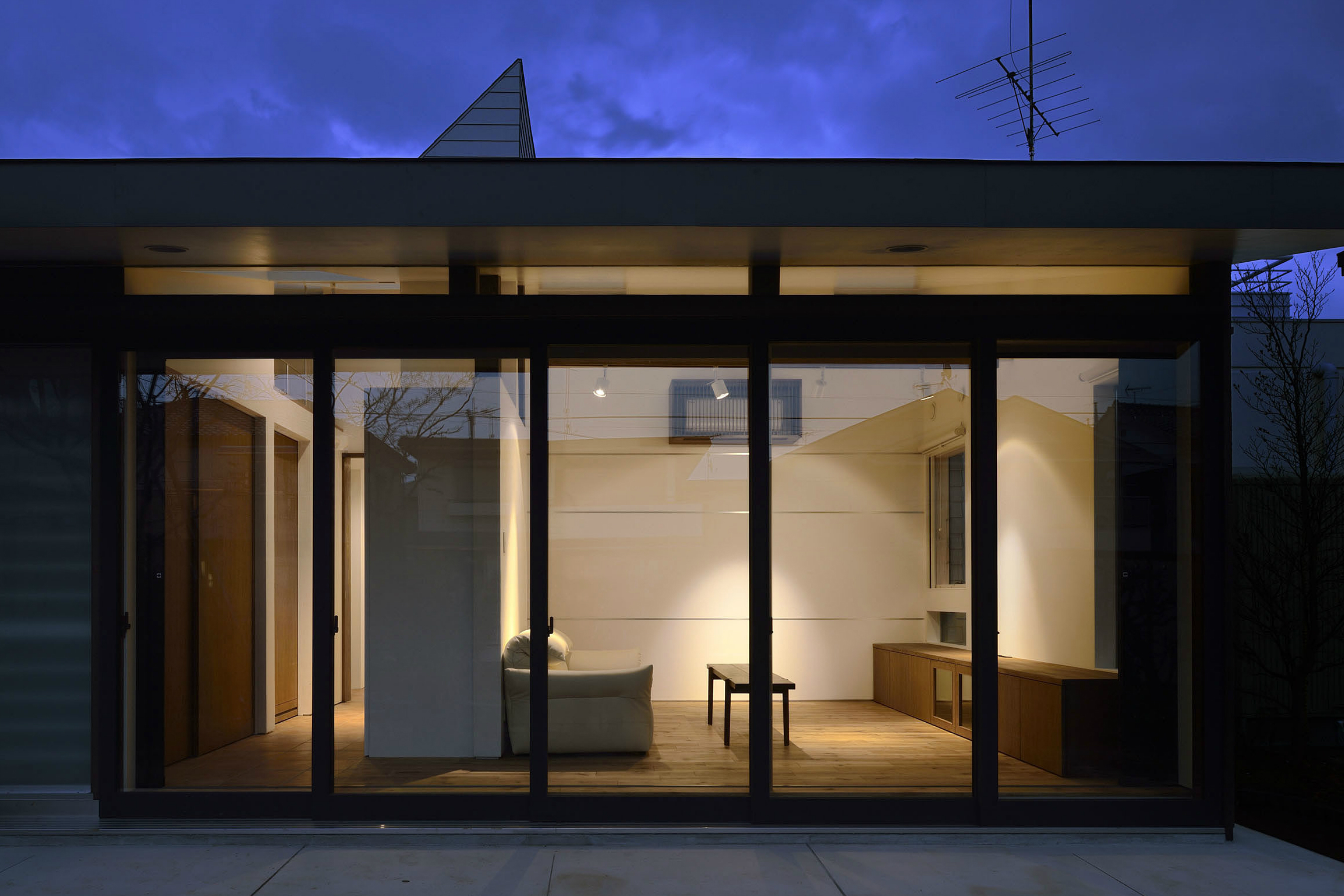 写真上:はなれの夜景。左側に収納とロフトがあってサッシは引き込める
