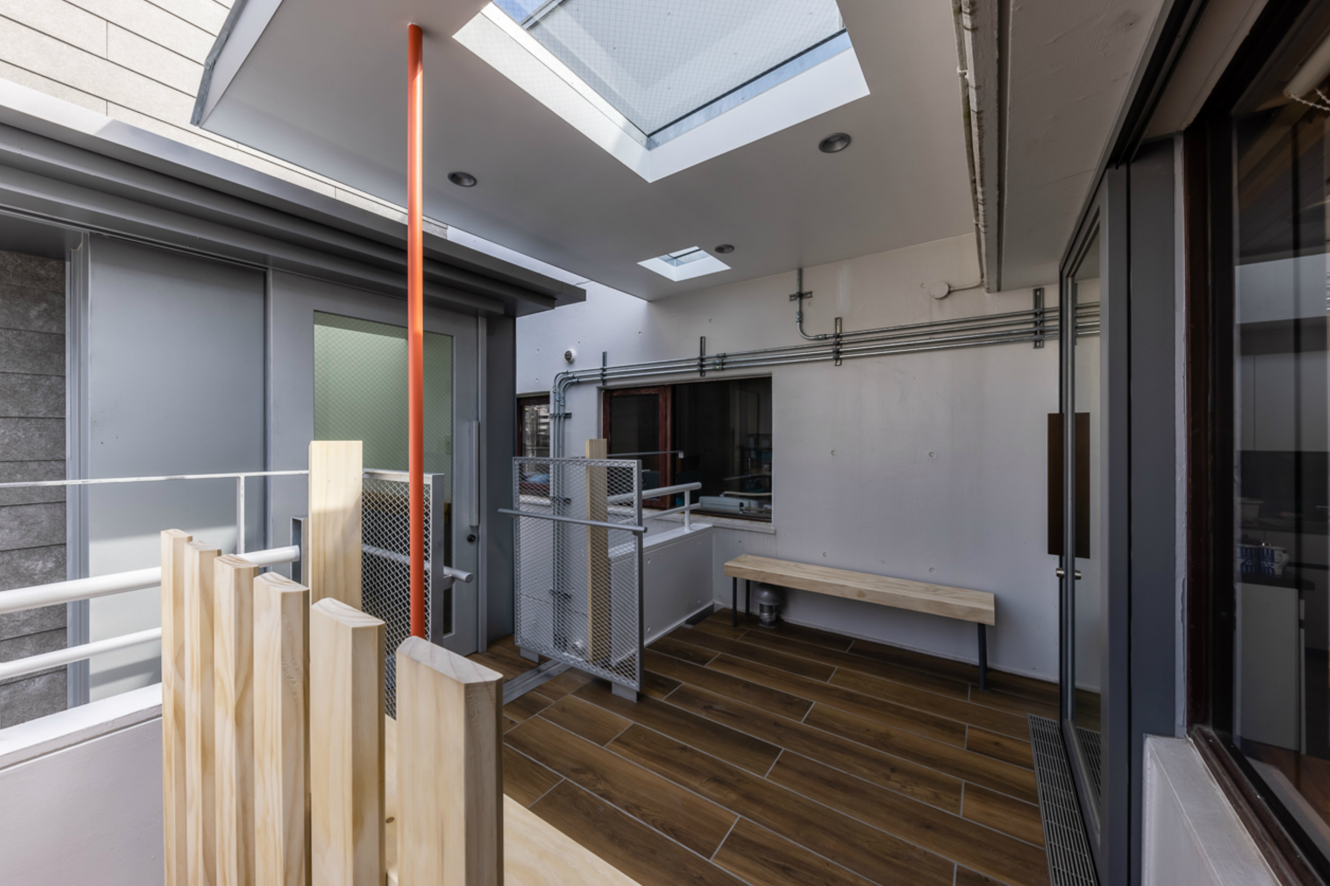 こうすることで『エレベーター棟』と母屋の隙間に、既存建築だけでは想像できない新しい坪庭やベランダの風景を創りました。