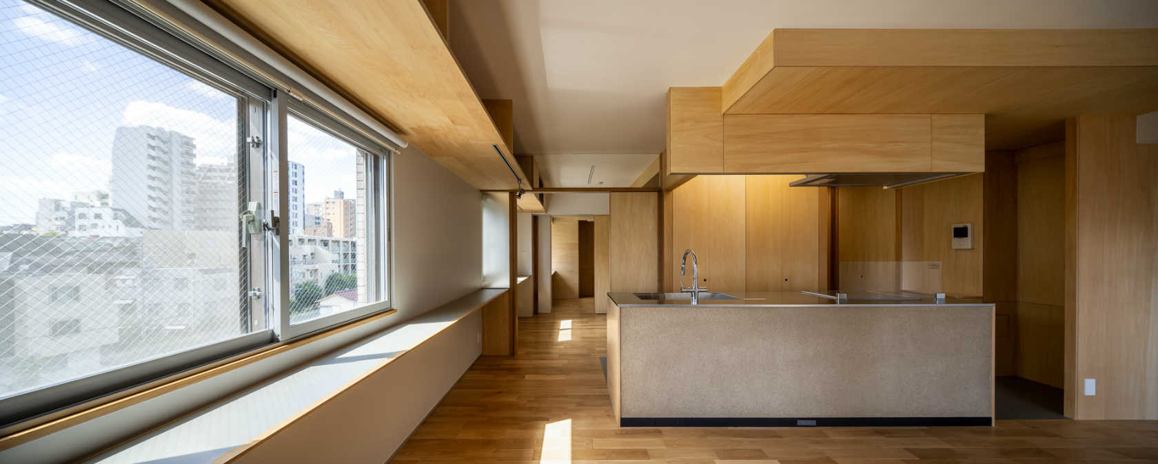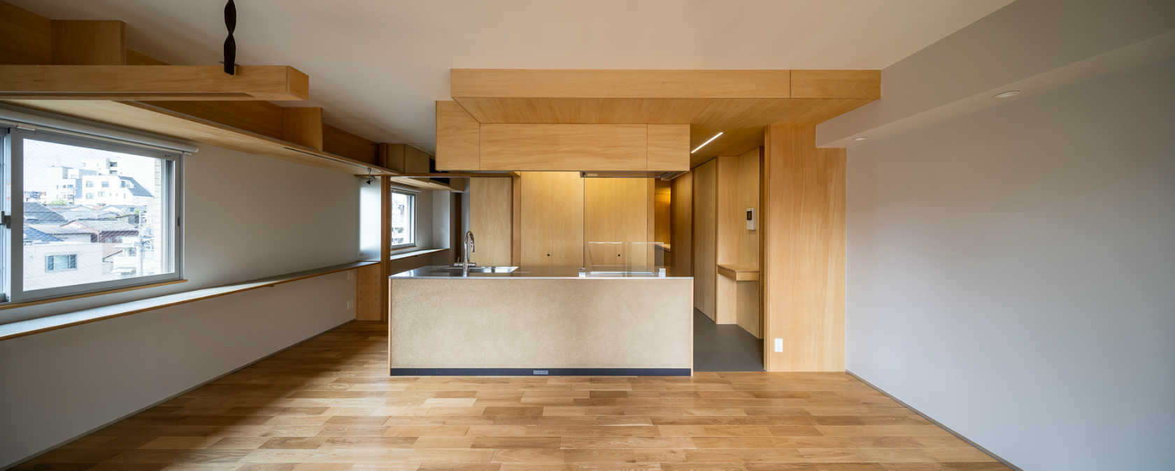 LDK空間/フルオープンな状態。写真上:左が個室に分節可能な〈空間動線〉で、右がユーティリティとして多様な使い方が可能な〈生活動線〉。中央の「木の箱」(=設備コア)を中心に回遊できる。写真下:〈空間動線〉をLDK側より見る※最終頁に図面を添付