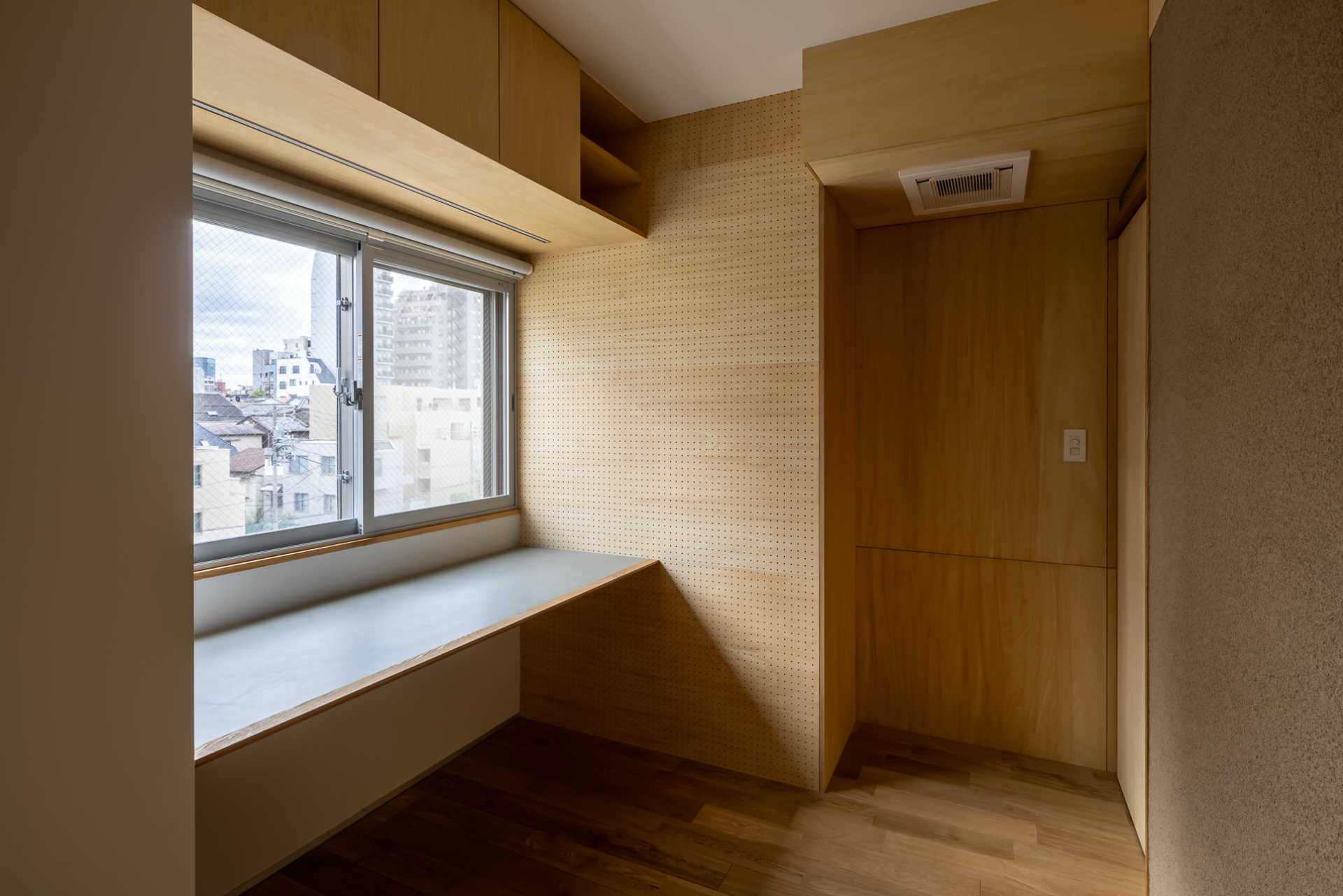 側壁の有孔べニアはフック金物を掛けられる仕様となっている