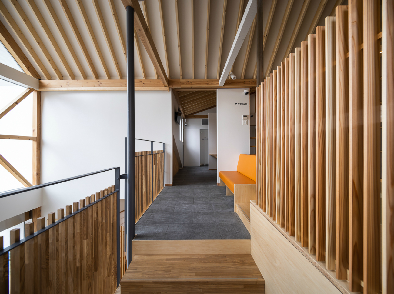 2階土間通路。子供を見守る保護者用のソファーとデスクが並んだ奥がトイレと授乳所になっている