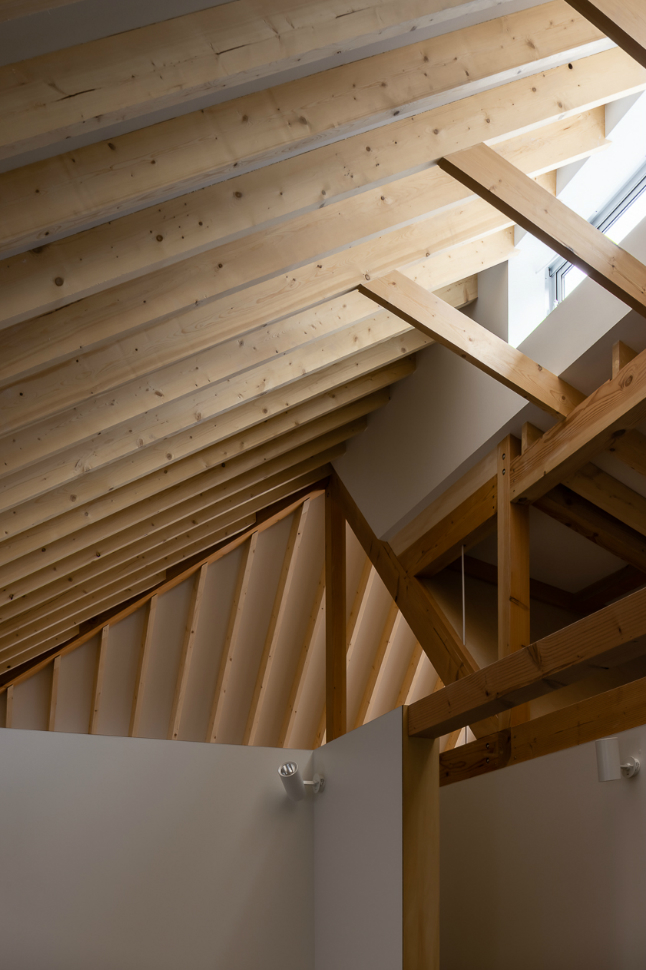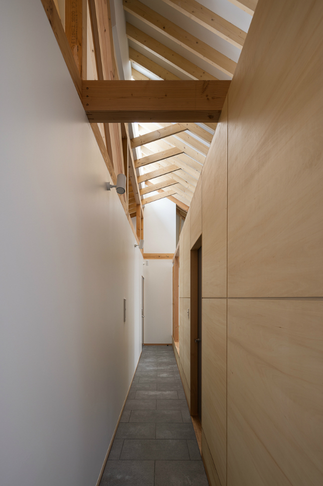 左:ハイサイドライトの詳細。右:スタッフエリア内の土間通路