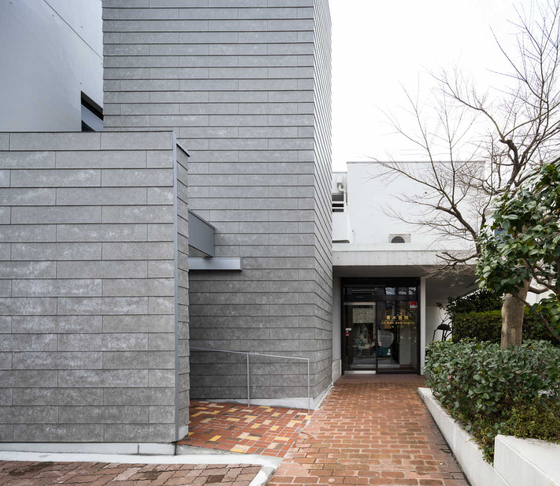 EV棟導入部。前面袖壁裏のスロープ通路が診療所のアプローチに接続する