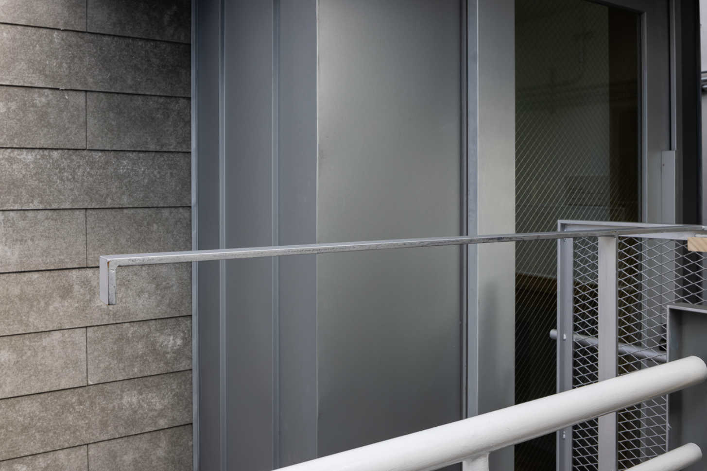 鋼製手摺の詳細。手摺高さ1.1m以上を確保するため、ベランダ床を上げた範囲に増設した